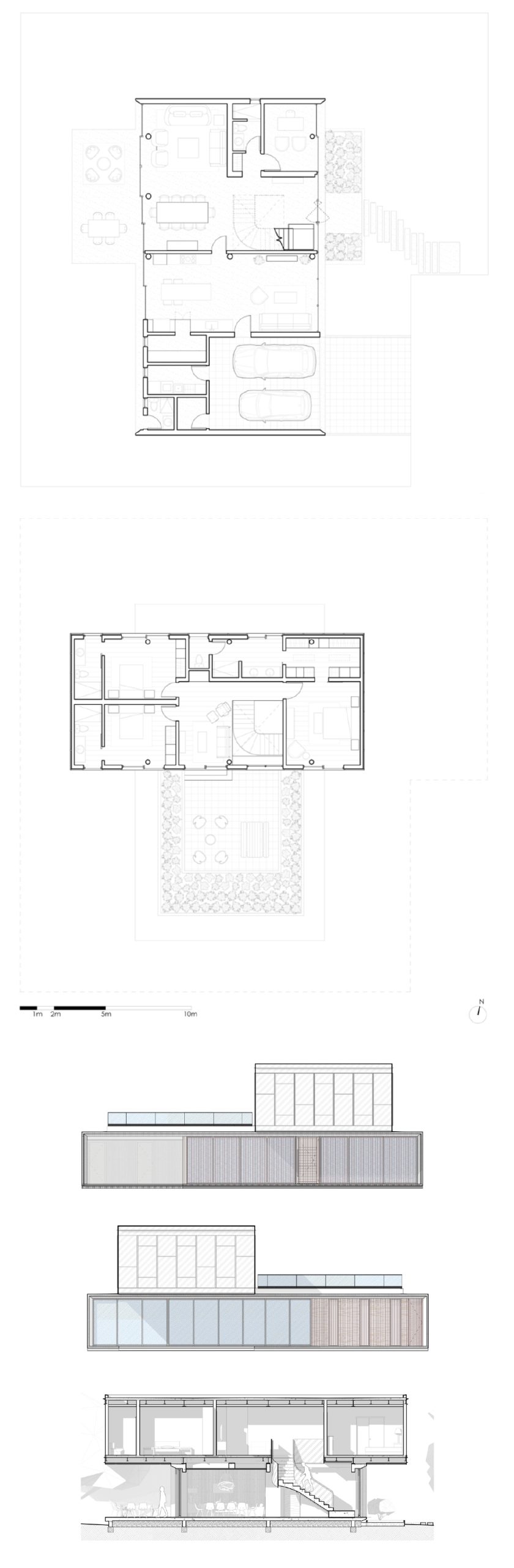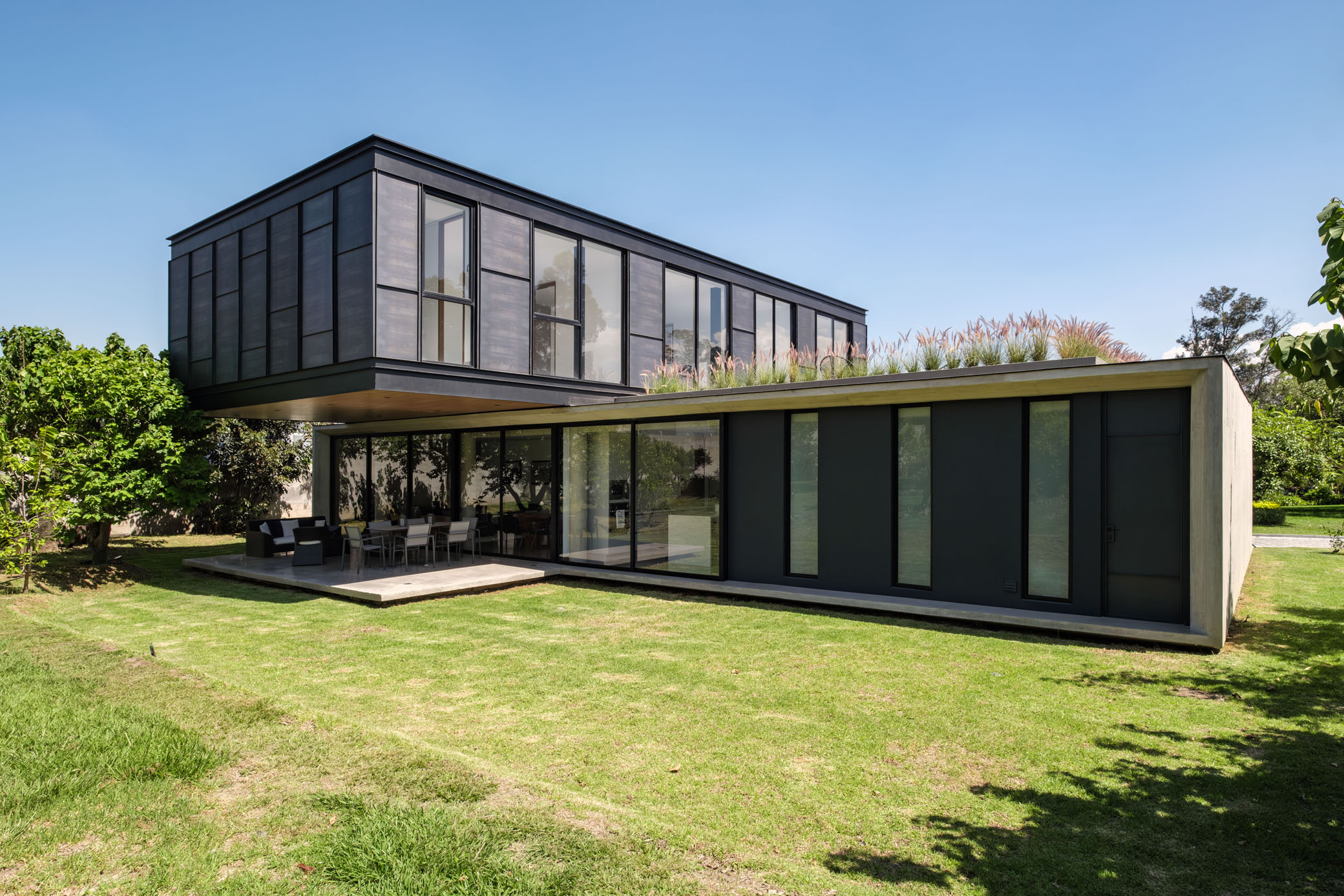 Esta casa contemporánea abarca una combinación armoniosa de funcionalidad y estética, creando un espacio habitable cálido y acogedor. El estilo moderno y minimalista de la casa se muestra a través del uso versátil de materiales, que incluyen hormigón visto, revestimientos metálicos y estructuras metálicas expuestas. Estos elementos se combinan para crear un diseño cohesivo y visualmente atractivo que refleja los deseos de los propietarios. Arquitectónicamente, la casa se caracteriza por dos cuboides distintos. El volumen inferior, elaborado en hormigón, alberga todas las áreas sociales de la casa.