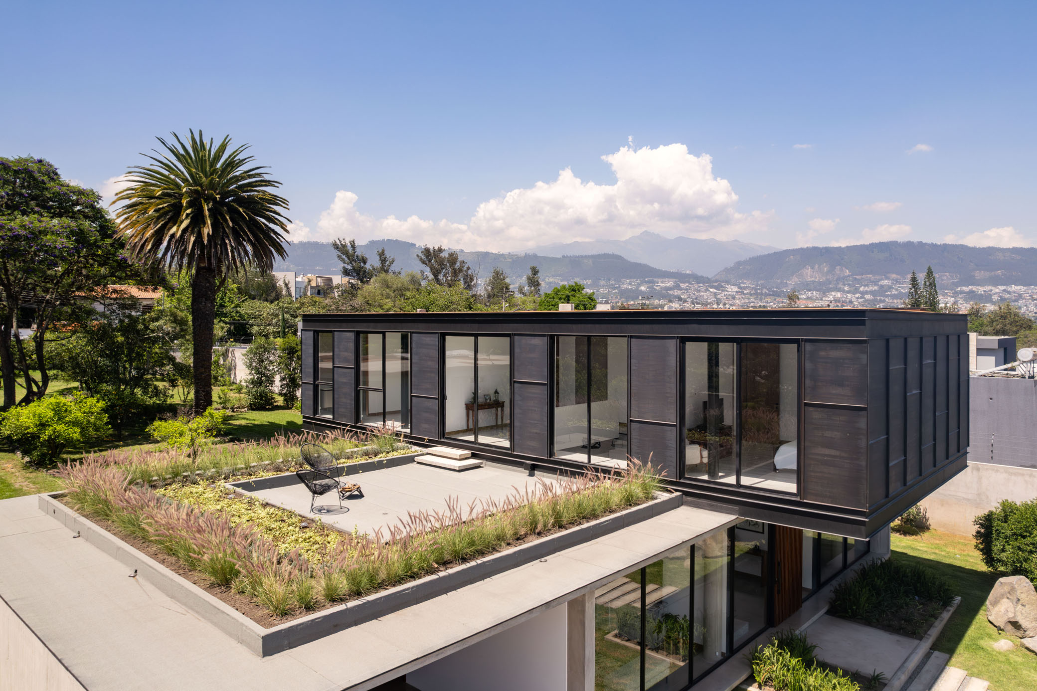 El volumen superior participa en un fascinante acto de equilibrio con voladizos que se extienden en ambos extremos. Estos voladizos forman la entrada y el porche, estableciendo las conexiones principales con el exterior. La interacción de estos dos cuboides, distintos en sus materiales y formas de construcción, crea un diálogo visual cautivador. Los espacios bien proporcionados de la casa exudan una sensación de comodidad y amplitud, realzada por columnas cuidadosamente pensadas en una configuración de planta abierta, que permiten una fachada libre. Los amplios ventanales inundan los interiores con luz natural, estableciendo una conexión con la vegetación circundante. La gran cocina se integra perfectamente con el exterior y la sala de estar, fomentando un sentido de unión familiar y fomentando momentos compartidos. Finalmente, una acogedora terraza verde, ubicada junto a las habitaciones, brinda un refugio tranquilo, ofrece impresionantes vistas del volcán Ilaló e invita a la relajación mientras beneficia el medio ambiente.