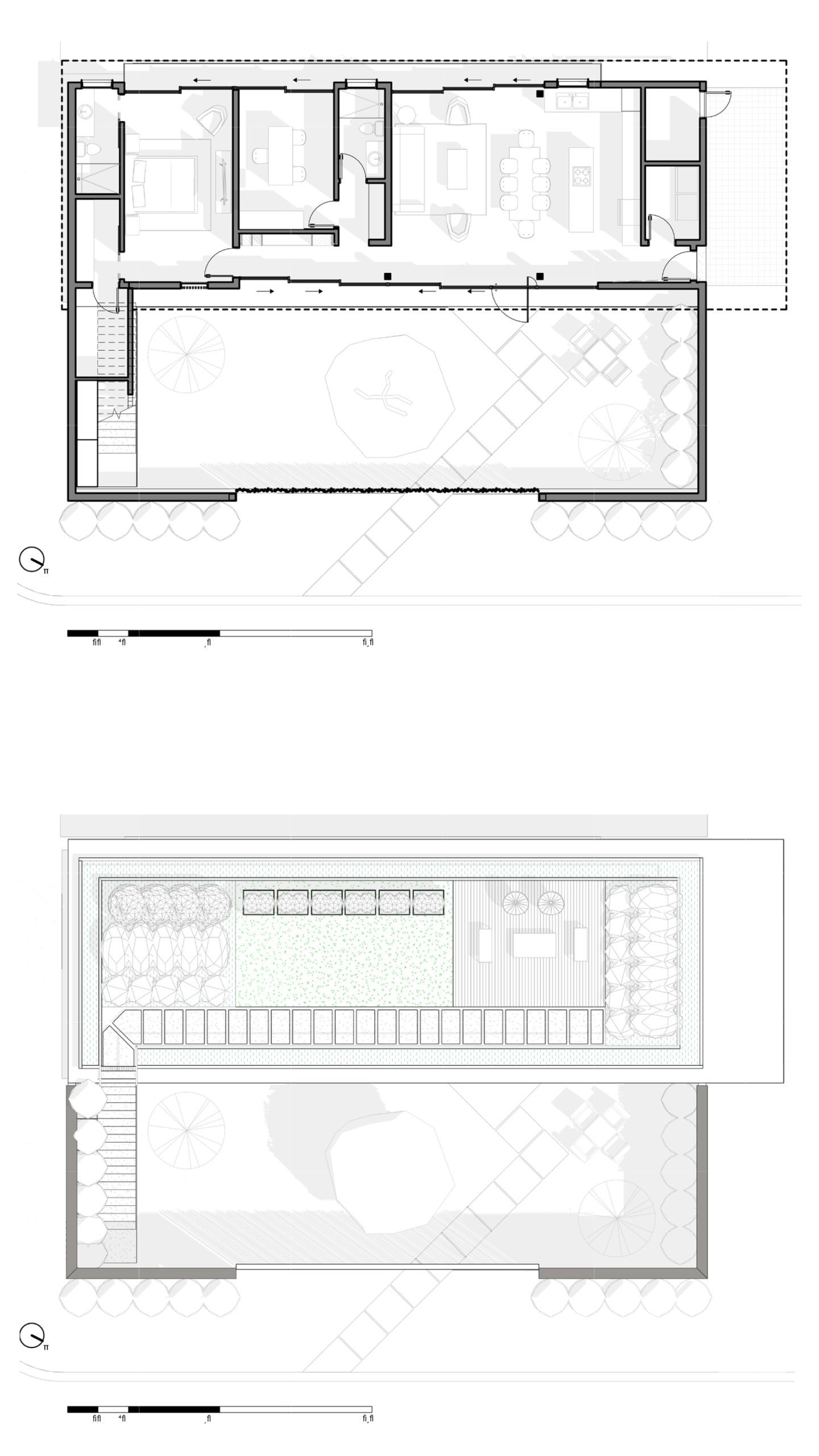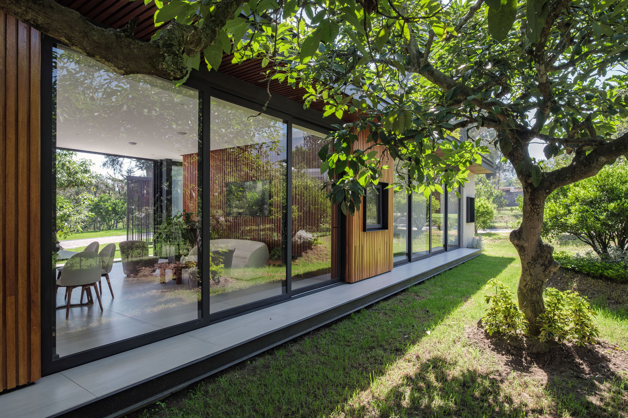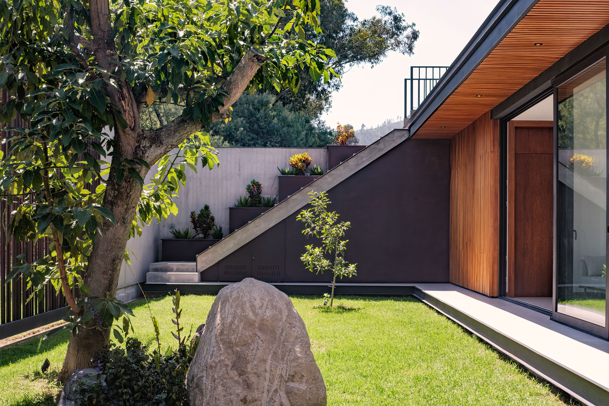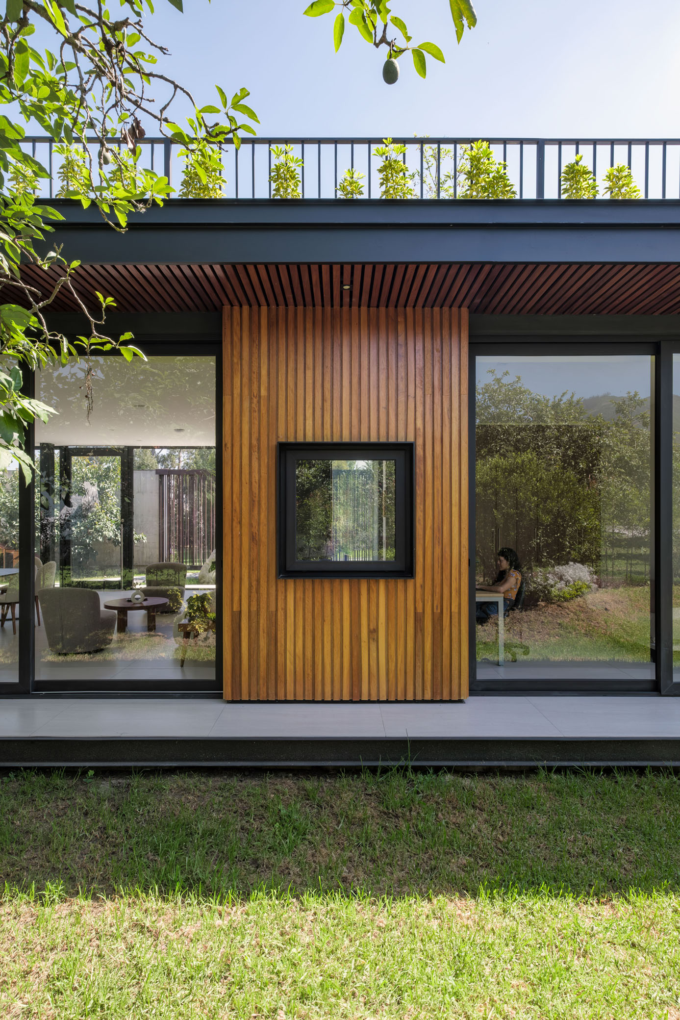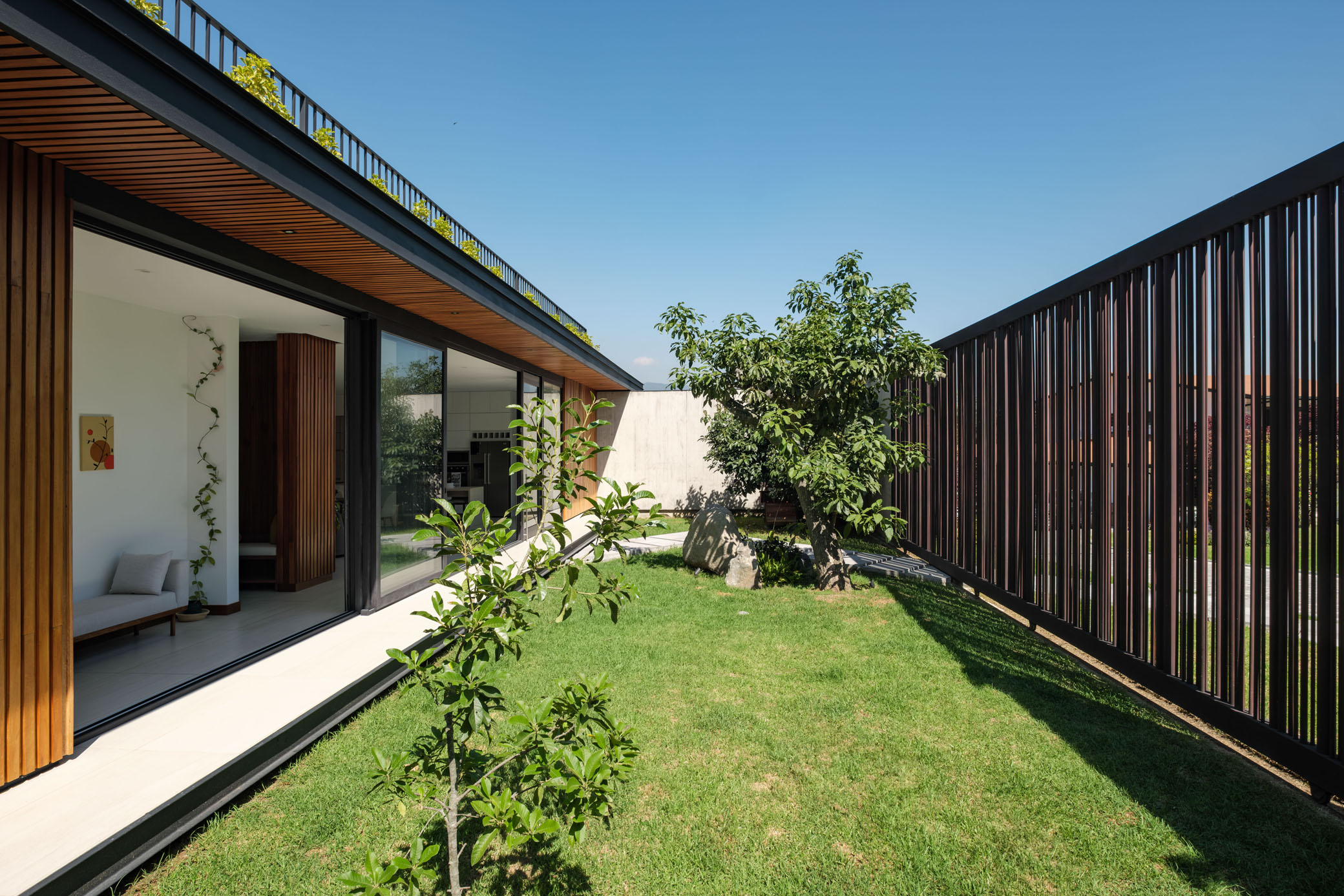 Surgida del deseo del propietario inspirado en la pandemia de conectarse con la naturaleza manteniendo total privacidad, esta residencia encarna una combinación armoniosa de vida interior y exterior. Los huéspedes son recibidos a través de un jardín interno que también funciona como plaza de entrada, un espacio físicamente dinámico que puede cerrarse o abrirse mediante dos puertas del tamaño de una pared. La ventilación cruzada sirve como medio principal de control de la temperatura, promoviendo la circulación natural del aire en toda la casa. Este enfoque se alinea con el énfasis de la residencia en espacios interiores dinámicos que hacen una transición sin esfuerzo entre configuraciones cerradas y abiertas, permitiendo que la naturaleza impregne los espacios habitables a través de generosas puertas corredizas acristaladas. En lo alto de la casa, una extensa azotea verde ofrece un refugio para tomar el sol y acogedoras hogueras nocturnas bajo las estrellas, lo que refuerza aún más la conexión con la naturaleza que impregna cada aspecto del diseño. El diseño arquitectónico minimalista, basado en formas geométricas limpias, promueve una sensación de claridad y eficiencia en la utilización del espacio. La residencia es un testimonio del poder transformador de la arquitectura en la creación de espacios que fomentan una conexión profunda con el mundo natural.